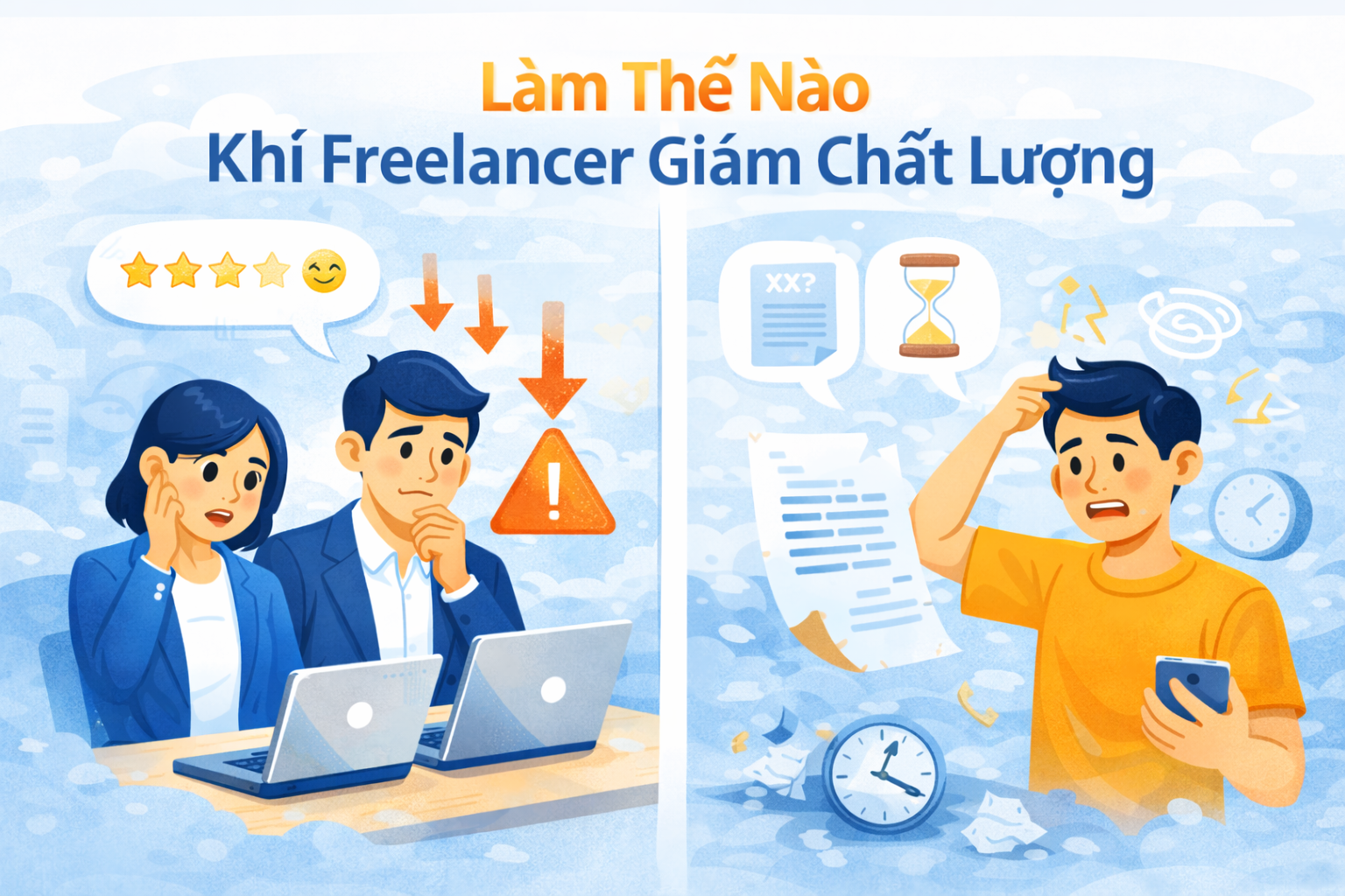 Ví dụ minh họa: Bạn đăng dự án thiết kế banner, chọn một freelancer làm rất nhanh và đẹp trong lần đầu. Nhưng đến banner thứ 4, họ gửi file với lỗi chính tả, không đúng kích thước, và không chịu sửa lại dù bạn đã nhắc. Đó chính là tình huống freelancer giảm chất lượng rõ ràng.
